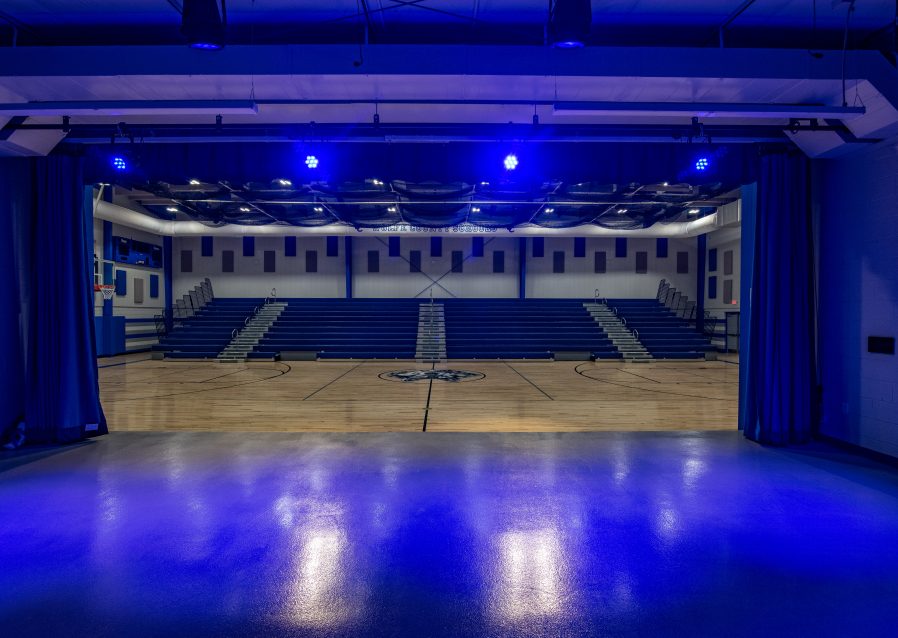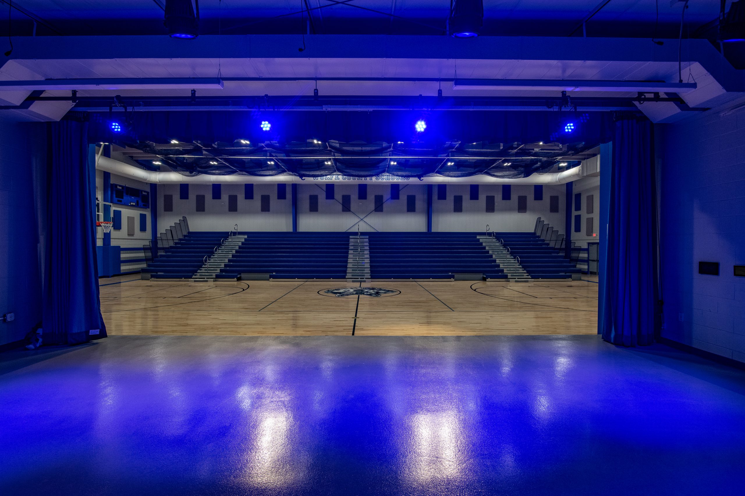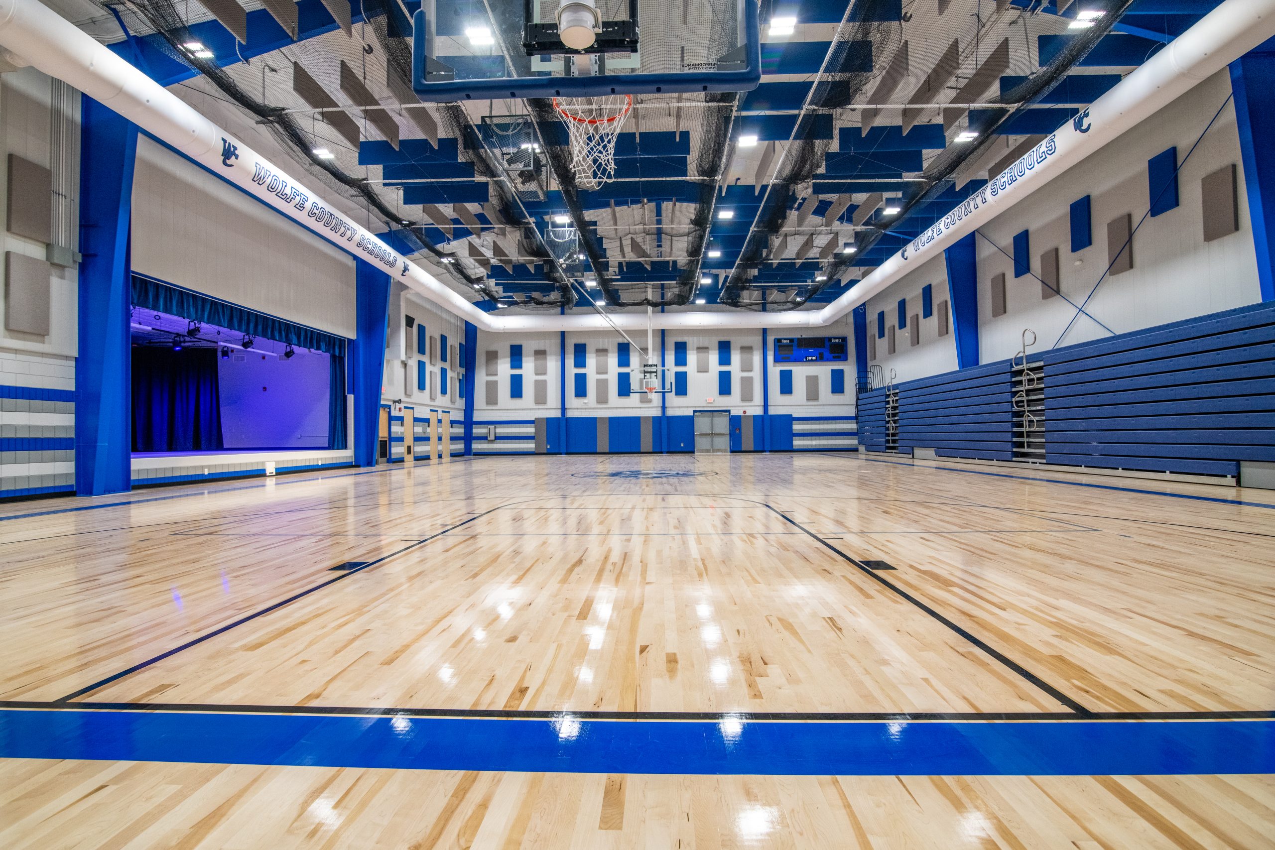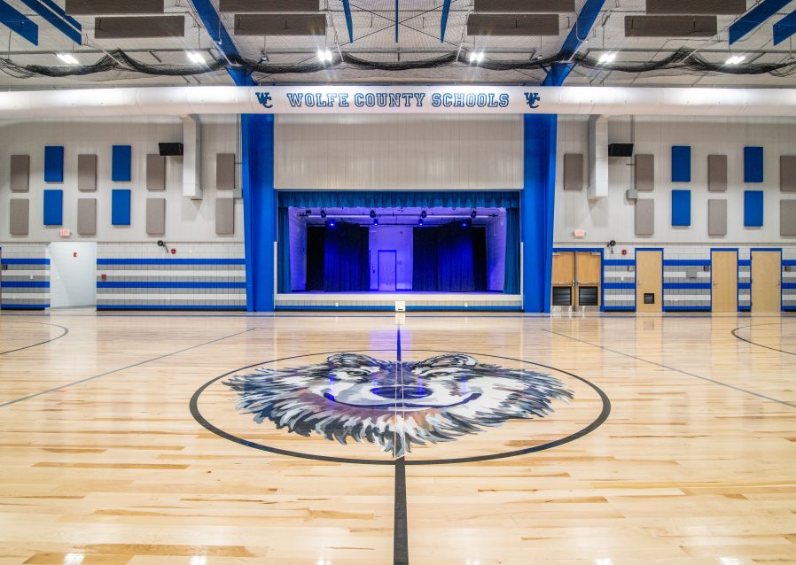 The Wolfe County Schools New Auxiliary Building is a newly constructed multipurpose auditorium intended to host school events such as sports practices, plays, and concerts. The building consists of a PEMB and brick exterior façade with interior finishes such as epoxy and MMA flooring, acoustical and porcelain ceiling tiles, wood gymnasium flooring, and bleachers. The facility includes a gymnasium, weight room, stage, and restrooms.